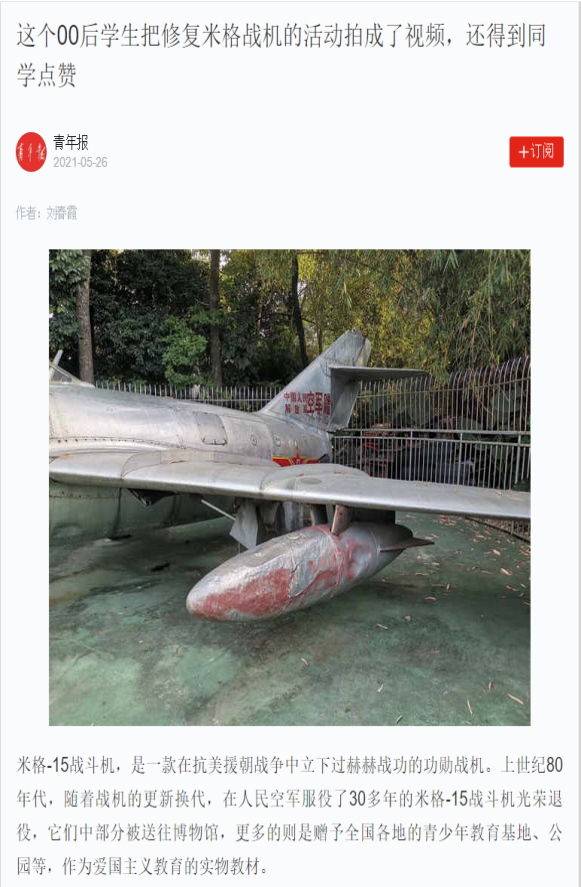 同时,深入挖掘学生身边的案例故事,22024班级郑健文同学参与修复米格战机的事迹在同学们中引起了不小的轰动,还登上了2021年5月26日的“学习强国”。